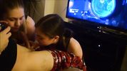 Пока парень играет в приставку, его тёлка с подружкой сочно насасывают ему хуй