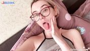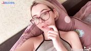 Молоденькая очкастая крошка гладит скромные сиси и трёт розоватую писечку
